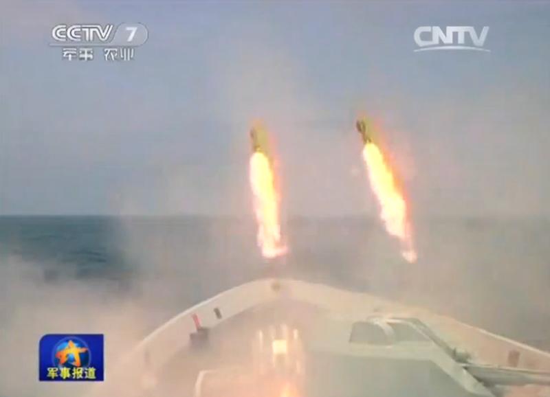 央视截图:南海舰队发射火箭深弹 精确打击藏匿潜艇