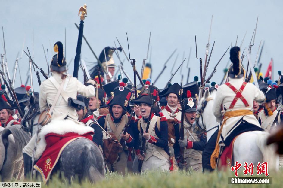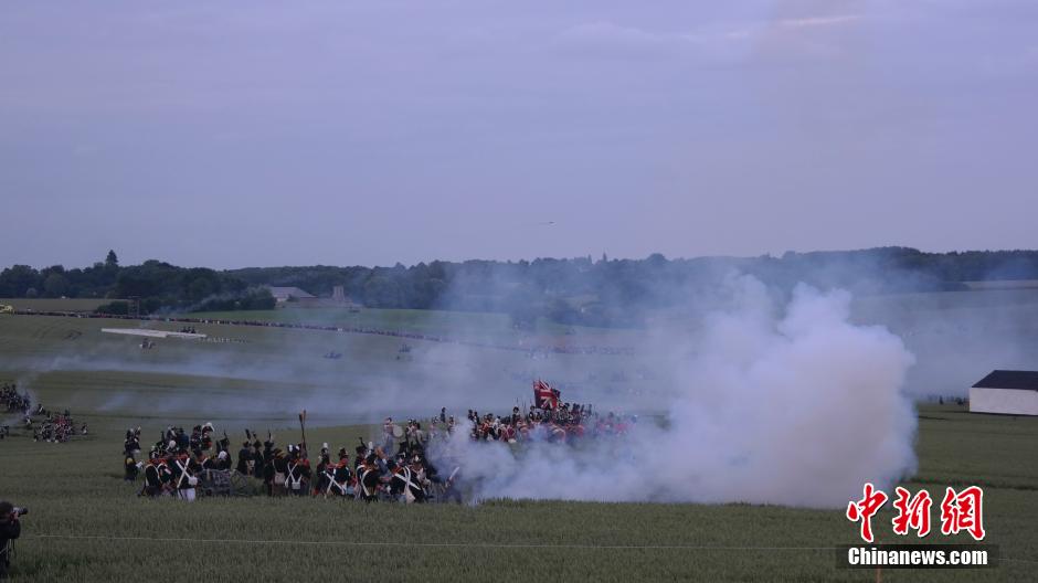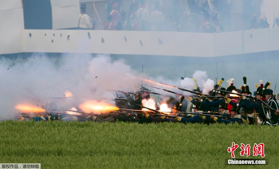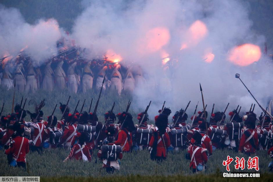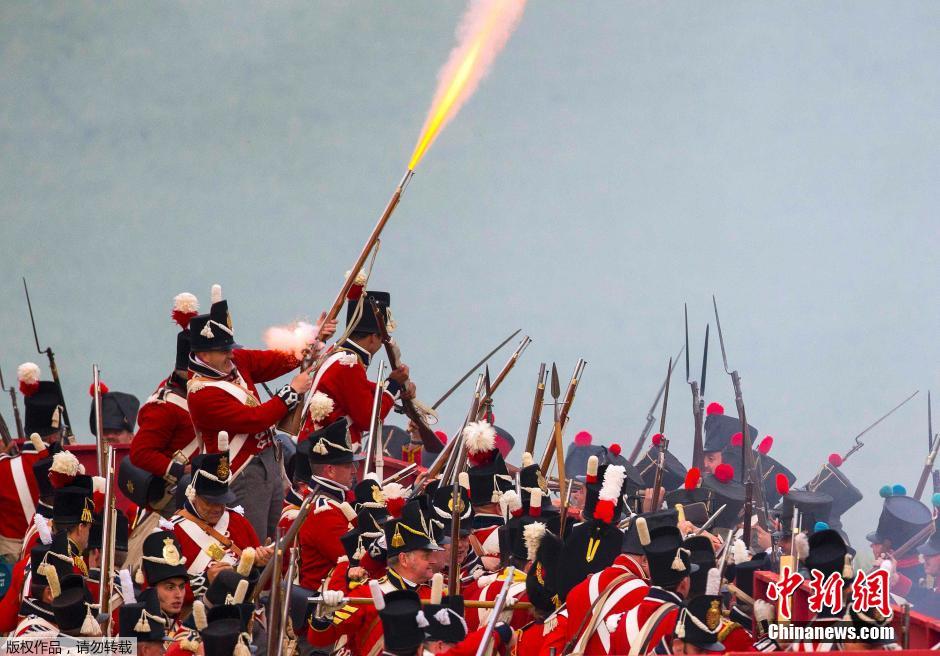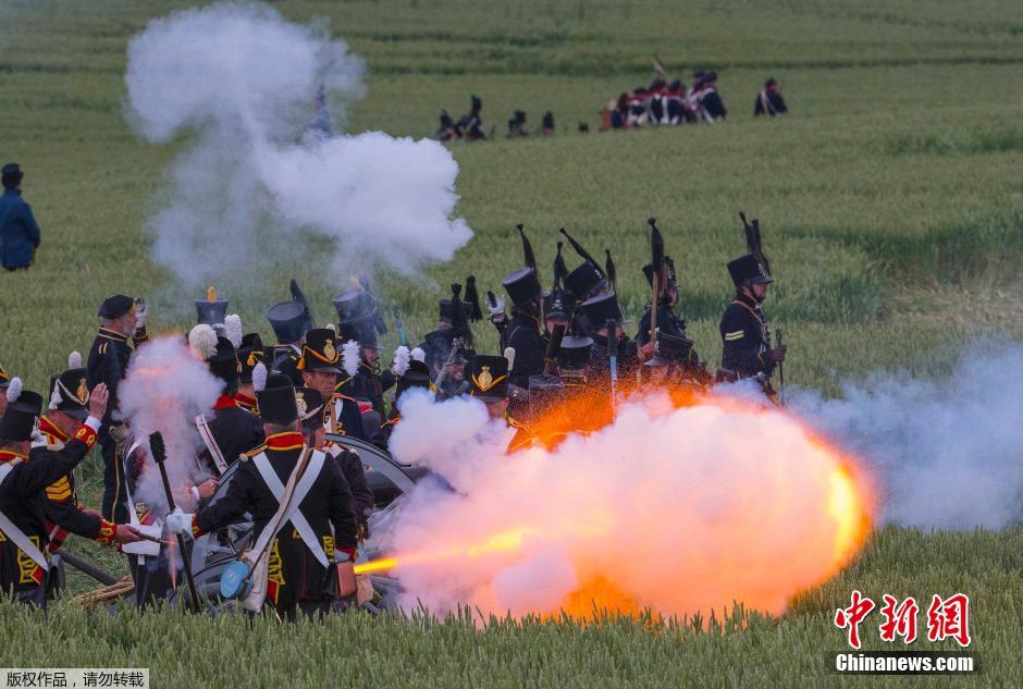 当地时间2015年6月19日,比利时布赖恩拉勒,历史爱好者重现战争场面,纪念滑铁卢战役200周年。在为期两天的纪念活动中,5000名历史爱好者、300匹马及100门大炮重演了滑铁卢战役的两个阶段。1815年6月18日,拿破仑率领的法国军队在滑铁卢被英国、荷兰、普鲁士等联军击败,拿破仑意图一统欧洲的梦想破灭,从此改写欧洲历史。滑铁卢之战不但成为军事史上重要战役,“滑铁卢”更是成为重大失败的代名词。中新社发 沈晨 摄