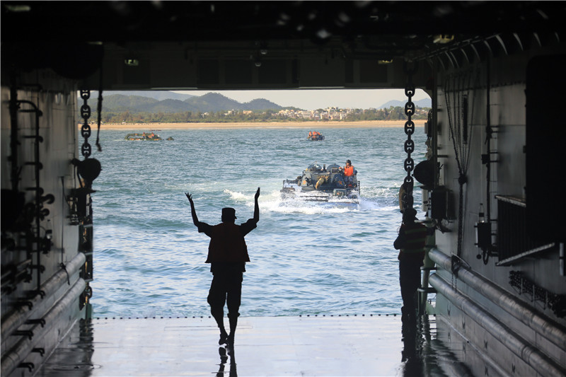 6月18日下午,海军陆战队某旅在登陆舰的配合下进行两栖装甲装备海上浮渡装卸载训练,提高部队实战能力。