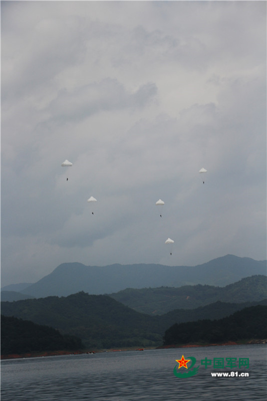 6月25日上午,南京军区某特战旅组织部队在闽南某水域进行水上跳伞训练,锤炼官兵复杂地域的伞降技能。