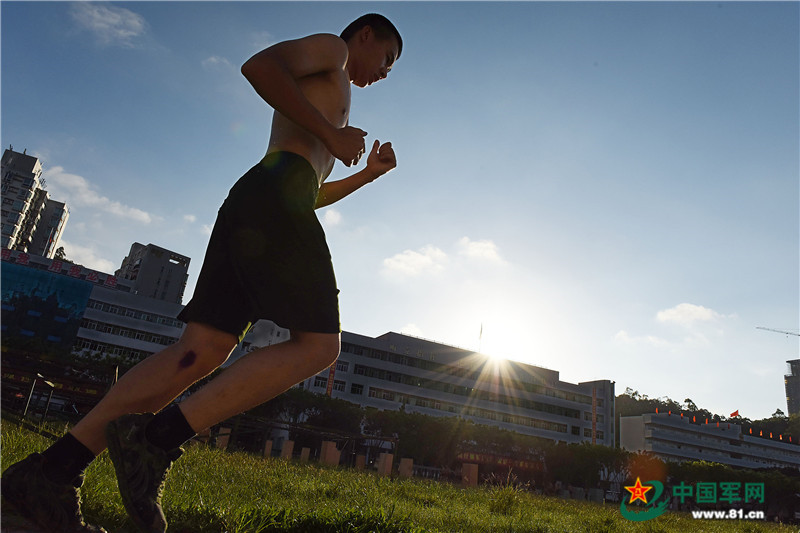 6月29日早晨,一名队员正在坚持长跑,尽管左腿膝盖受了伤。