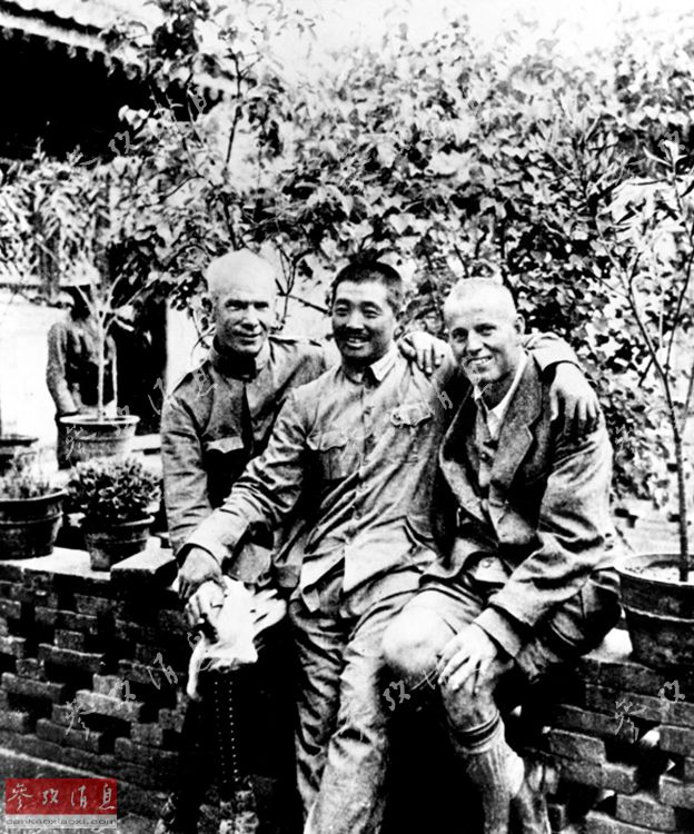 1938年5月,白求恩(左)从延安奔赴晋察冀前线时,在山西岚县与120师师长贺龙、美国大夫布朗(右)合影。