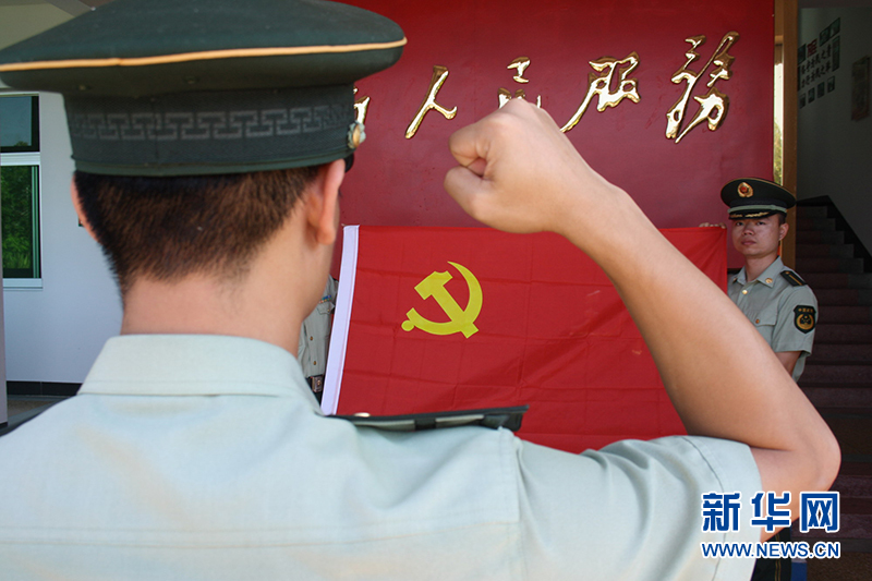 6月30日上午,福建漳州边防支队云霄边防大队东坑边防派出所官兵紧握右拳,面向党旗庄严的宣誓,重温了入党誓词。这是这个大队开展迎七一建党节的一个缩影。