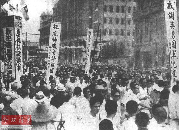 日本宣布投降后,武汉市民涌上街头庆祝抗战胜利。(资料图片)