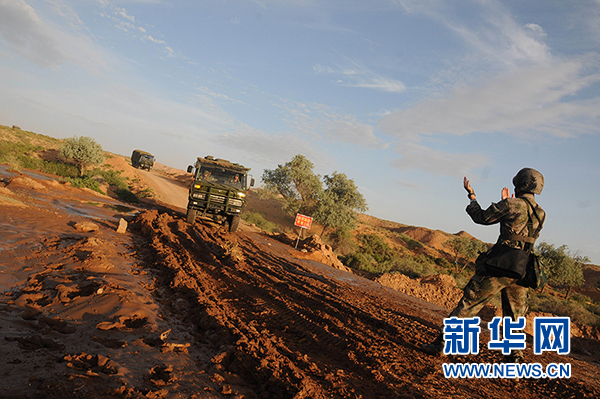 “火力—2015·山丹”参演部队正在通过被山洪冲毁路段。新华社记者 黎云摄