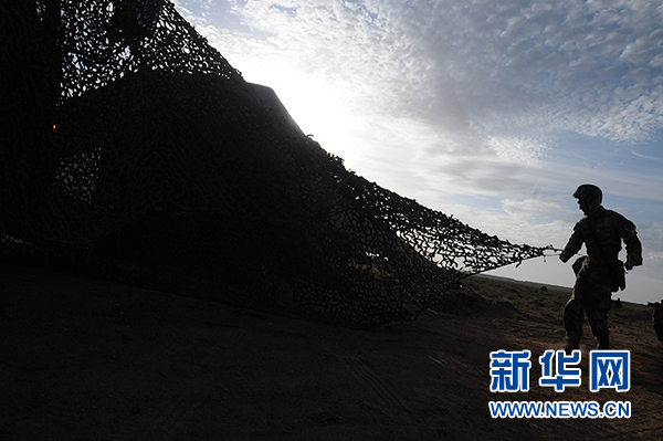 “火力—2015·山丹”参演部队行军途中遭敌空中侦察,正在组织隐蔽伪装。杨茹摄