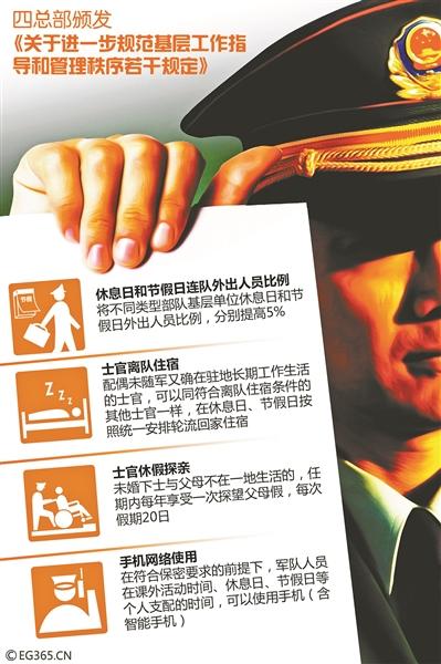 据“军报记者”微博昨日报道,四总部日前颁发《关于进一步规范基层工作指导和管理秩序若干规定》,要求全军和武警部队进一步规范基层工作指导和管理秩序,其中发布了多项为基层官兵减负减压和送福利的措施。