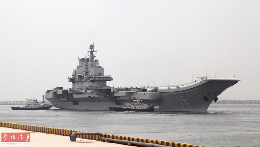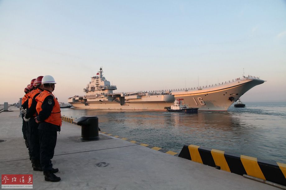 11月26日,辽宁舰从山东青岛某军港解缆起航。当日,我国第一艘航空母舰辽宁舰从山东青岛某军港解缆起航,在海军导弹驱逐舰沈阳舰、石家庄舰和导弹护卫舰烟台舰、潍坊舰的伴随下赴南海,并将在南海附近海域开展科研试验和训练。新华社发(逄忠平 摄)
