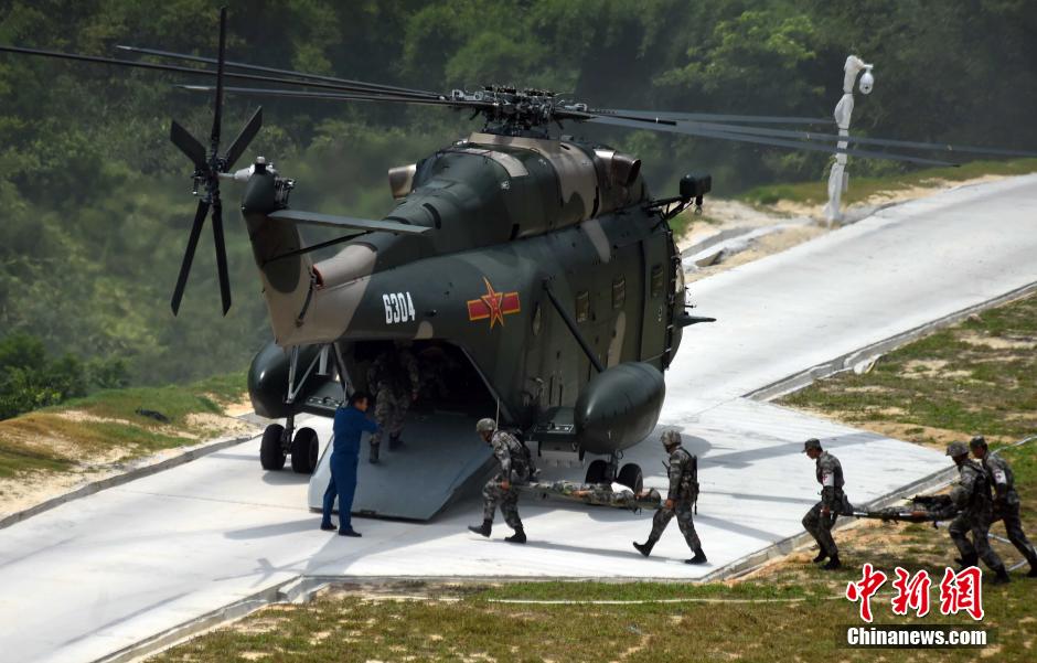 7月4日上午,中国人民解放军驻香港部队在青山训练场组织“香江卫士—2015C”联合军事演习,邀请了香港各界500余名嘉宾现场观摩。该演习是青山综合训练首次开放活动。图为直-8kH型直升机运送伤员。 中新社发 张宇 摄