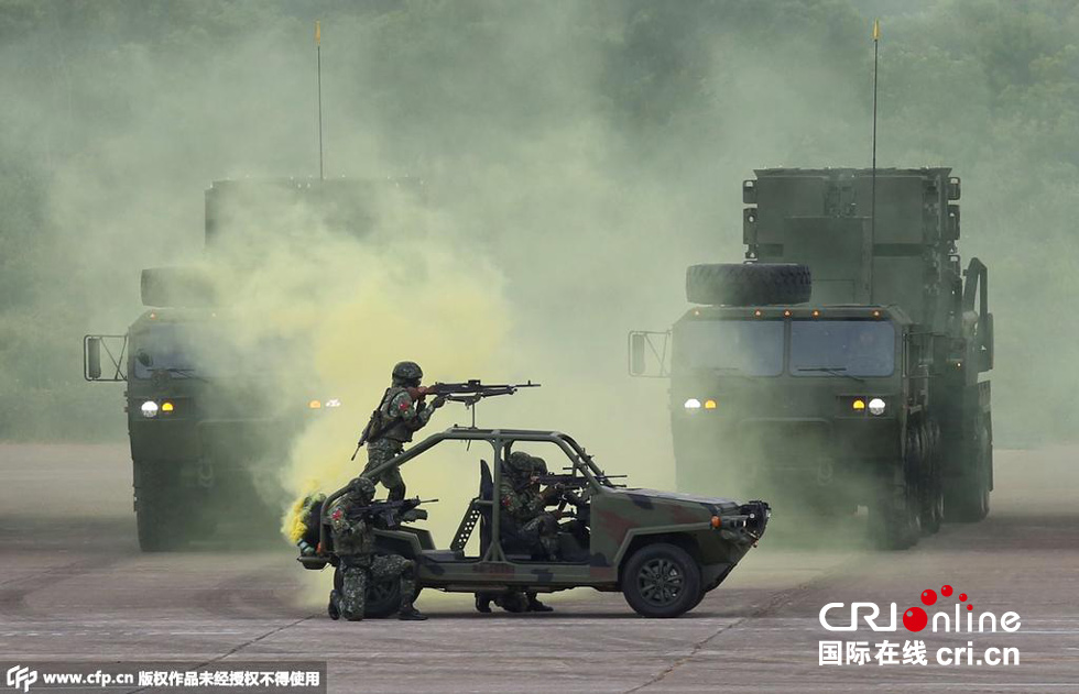 2015年7月4日,为纪念抗战胜利70周年,台湾的防务部门4日在新竹湖口基地举行防务战力展示,这是马英九任内最后一次大规模公开校阅台军部队。台军亮相武器装备、涉日风波等成为关注点。 图片来源:cfp