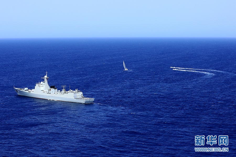 海面上,中国海军第二十批护航编队济南舰和千岛湖舰组成“人”字队形,共同护送由航海家翟墨率领的“东南卫视”号帆船缓缓向西航行。