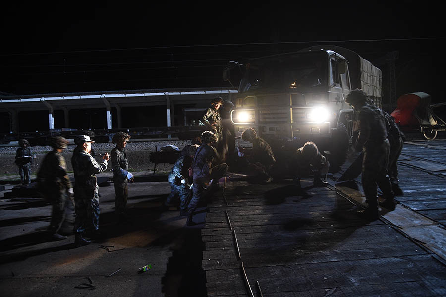7月8日,参加“火力-2015��山丹B”演习的新疆军区某防空旅,在山丹火车站搭建野战卸载站台。刘逢安 摄