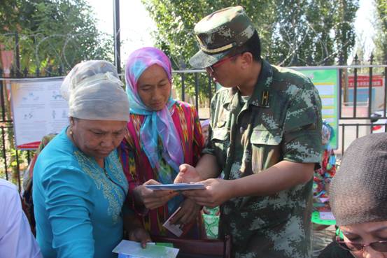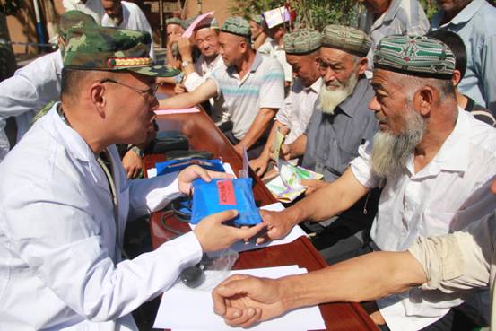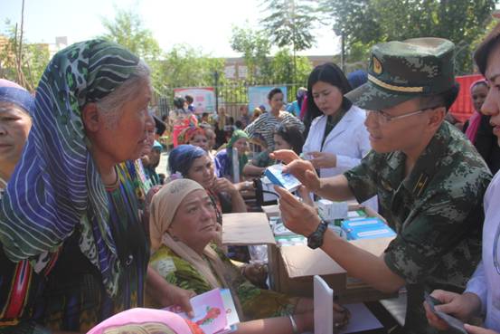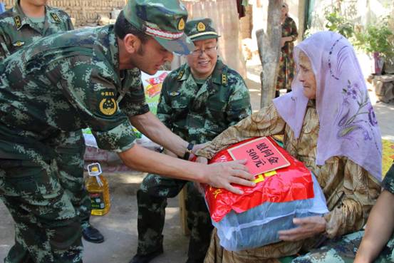 活动中,任党国支队长、杨永红政委来到英买里村,与工作队一起为村民进行法制宣传,并走访慰问两名特困村民,赠送了米面油、军被等生活用品和慰问金。支队派出的军医携带血压计、B超机、心电图机等医疗器械为500余名群众进行了义务就诊,并免费发放5000余元的日常非处方类药品。