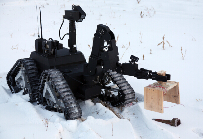 这种弹药销毁作业车,更常被称作“弹药销毁机器人”,主要元件包括作业车主体、控制台、电动收揽装置和辅助装置(各种工具、功能作业包、各类手爪、无线传输模块、三角支架等)。该机器人主要采用遥控方式实现载车地面移动,实现各项预定功能。通过无线或有线方式遥控载车完成引爆药的放置、未爆弹销毁等作业,通过无线图像传输系统将载车的摄像头捕获的现场视频图像传送到操作台显示分系统,供指挥员参考,并以此为依据对弹药销毁作业进行实时监控和修正,确保销毁作业百分百成功。可以说,弹药销毁机器人的出现,除了大大增加爆破作业安全系数之外,也使得未爆弹丸销毁由人工走上了机械化的道路。