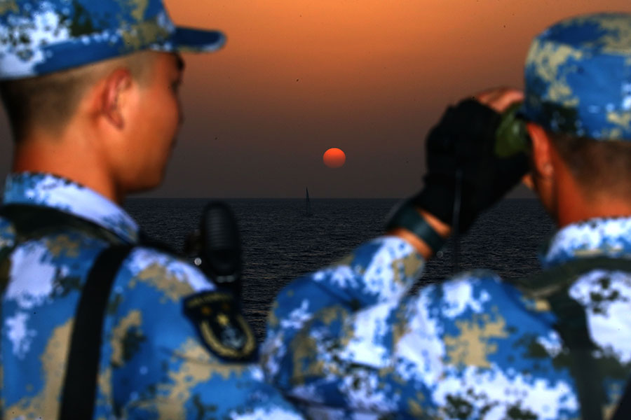 济南舰特战队员时刻保持警惕,确保帆船安全。