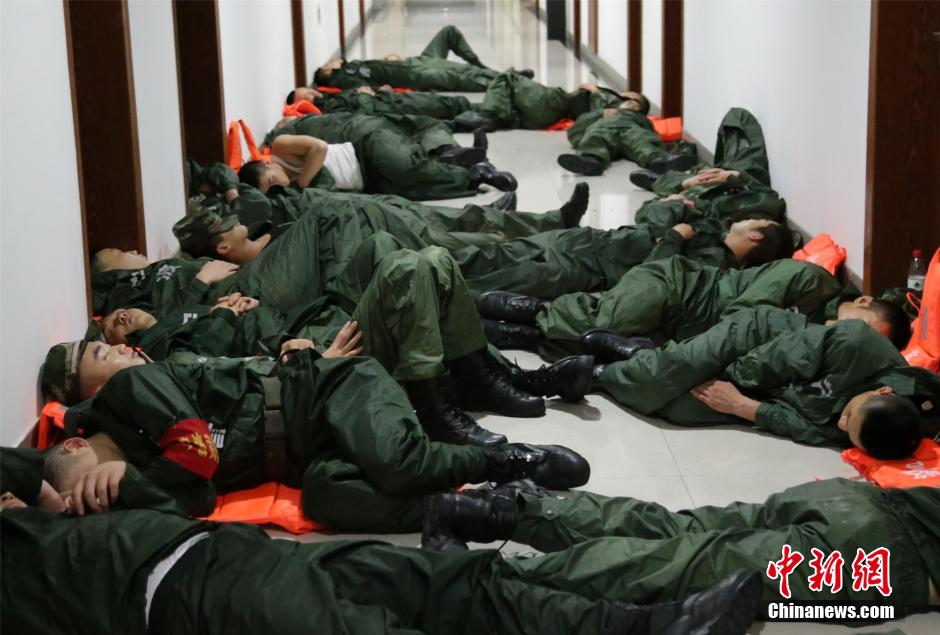 第9号台风“灿鸿”挟风裹雨袭击浙江沿海,浙江姚江受特大暴雨影响水位不断上涨,相继出现道路受阻、村庄被淹等灾难。武警宁波支队紧急出动150名武警官兵迅速开赴该余姚地区进行抢险,5小时内,官兵顶风冒雨装填沙袋360吨。在救灾现场,官兵们的战靴都能直接倒出水来,而轮休下来的几十名官兵因近日来超负荷运作,直接蜷曲在狭窄的廊道倒地而睡。李宁 摄