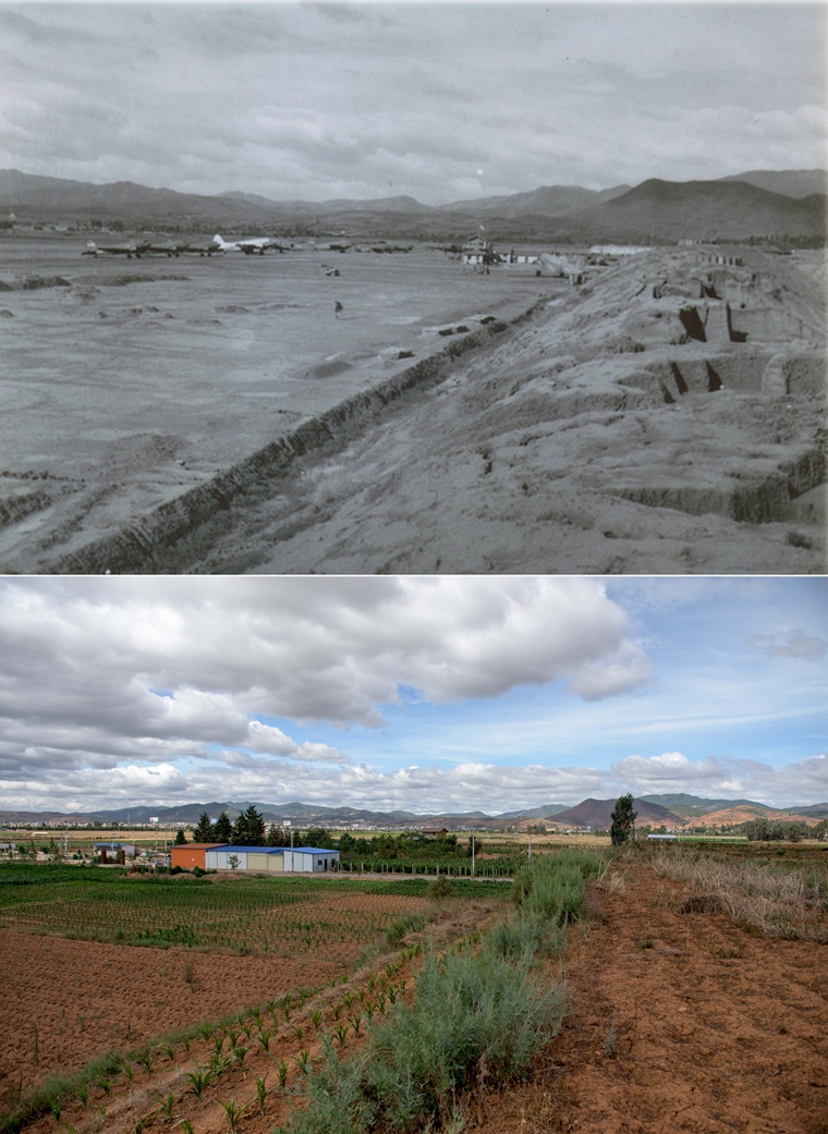 上图:抗战时期的云南驿机场(资料照片);下图:2015年6月29日同位置拍摄的云南驿机场遗址。1942年日军侵占怒江以西后,云南驿战略地位更加凸显,茶马古道、滇缅公路、驼峰航线在此交会,成为盟军中缅印战区重要的前线机场。