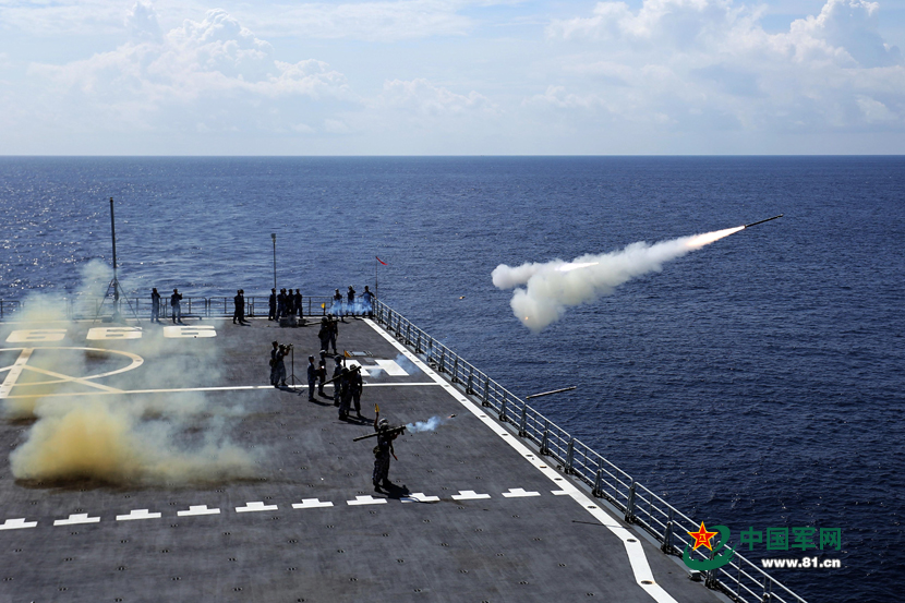南海舰队官兵战舰上发射肩扛式防空导弹