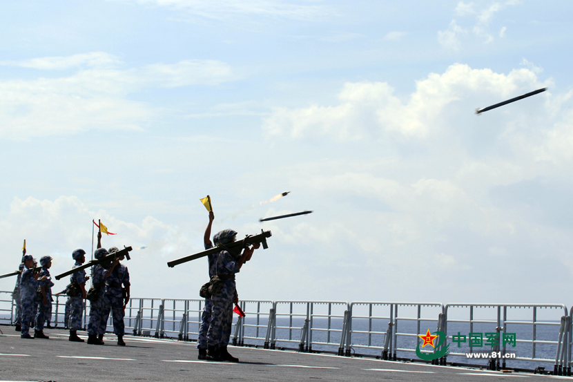 南海舰队官兵战舰上发射肩扛式防空导弹