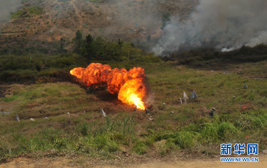 7月15日,狼牙山五壮士连举行步兵特战化综合科目演练。喷火器对敌暗堡进行火焰压制。杨茹 摄