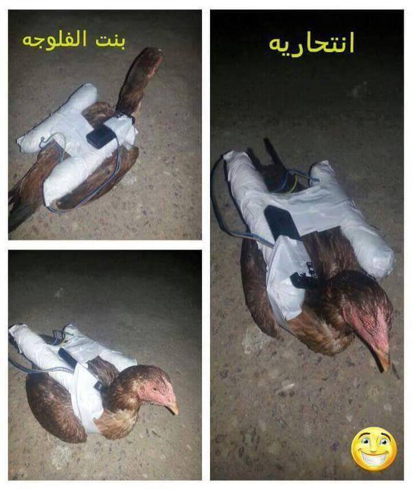在伊拉克战场上,IS极端武装分子的自制武器可谓是花样百出。近日在国外社交网站上曝光的照片显示,伊拉克的极端武装分子发明了一种以鸡作为载体的自杀式爆炸袭击武器。其实就是把遥控炸弹绑在鸡的身上,当伊拉克部队靠近时就将鸡释放,冲到对方阵地后引爆。