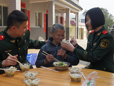 边防官兵照顾老人吃饭