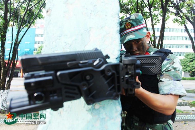 在墙角处,一支枪管伸出,却不见人影。“啪啪啪”,枪响了,目标倒地,抹彩的武警战士从墙角跃出,直奔目标……这是记者在广东边防总队机动支队马塘尾训练基地看到的一幕,反恐中队正在持最先进的“拐弯枪”进行射击训练。