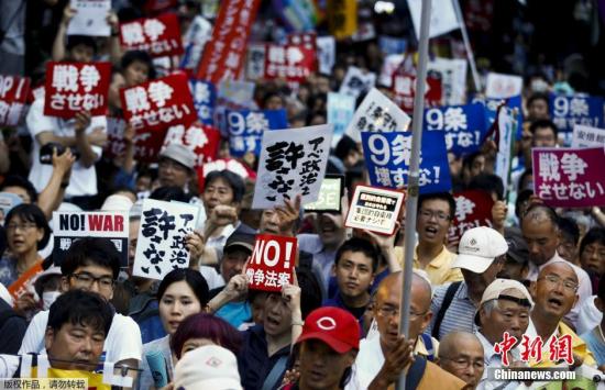 7月16日,在日本东京国会附近,人们手举标语参加抗议安保法案游行活动。15日至16日,日本首相安倍晋三及执政联盟强行推动国会众议院通过安保法案,引发日本民众强烈抗议。