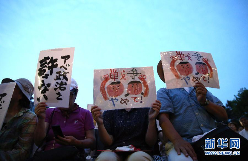 7月24日,在日本首都东京,抗议者手持“不要战争”和“安倍政治零容忍”的标语参加集会。