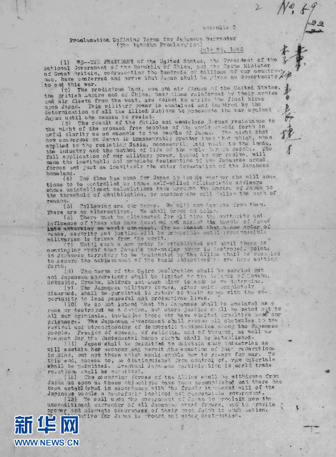 这是收藏于中国第二历史档案馆的《波茨坦公告》(英文抄本)。 1945年7月26日,德国柏林西南波茨坦,一份为构建战后国际秩序、确立亚洲和平稳定发展奠定基础的重要文件——《波茨坦公告》诞生。 70载流光易逝,国际局势风云变幻,世界各国人民携手维护战后和平与稳定初心不变。 70年后的今天,凝结着千千万万生命和鲜血的正义言辞犹在耳畔。捍卫《波茨坦公告》,就是捍卫二战胜利成果,对维护东亚地区乃至世界和平稳定、防止日本重走军国主义道路具有重大现实意义。新华社发(图片由中国第二历史档案馆提供)
