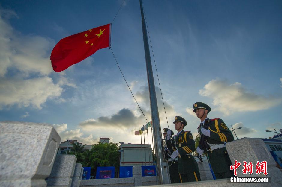 7月24日6时50分,鲜艳的五星红旗伴着朝阳在海南省三沙市政广场冉冉升起。海南省三沙市为庆祝设市三周年分别在西沙群岛的永兴岛、赵述岛、北岛、晋卿岛、鸭公岛、甘泉岛、银屿、羚羊礁,以及南沙群岛美济礁9个岛礁举行联动升旗仪式,旗手均系岛礁民兵国旗班民兵。 骆云飞 摄