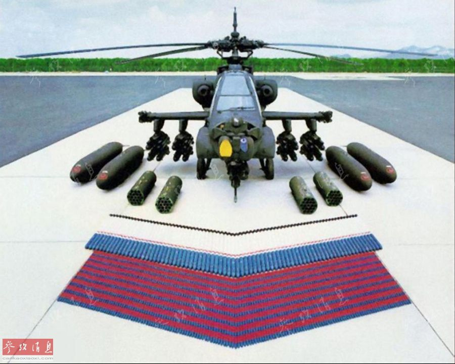 除了有完备的防护系统和精良的观瞄系统外,阿帕奇最重要的就是由”三大杀器“组成的强大火力系统。图为AH-64的地面武器展示,从近至远依次为30毫米机关炮弹药、70毫米火箭弹和机身上挂载的“地狱火”导弹,左右最外侧的为转场飞行用的副油箱。