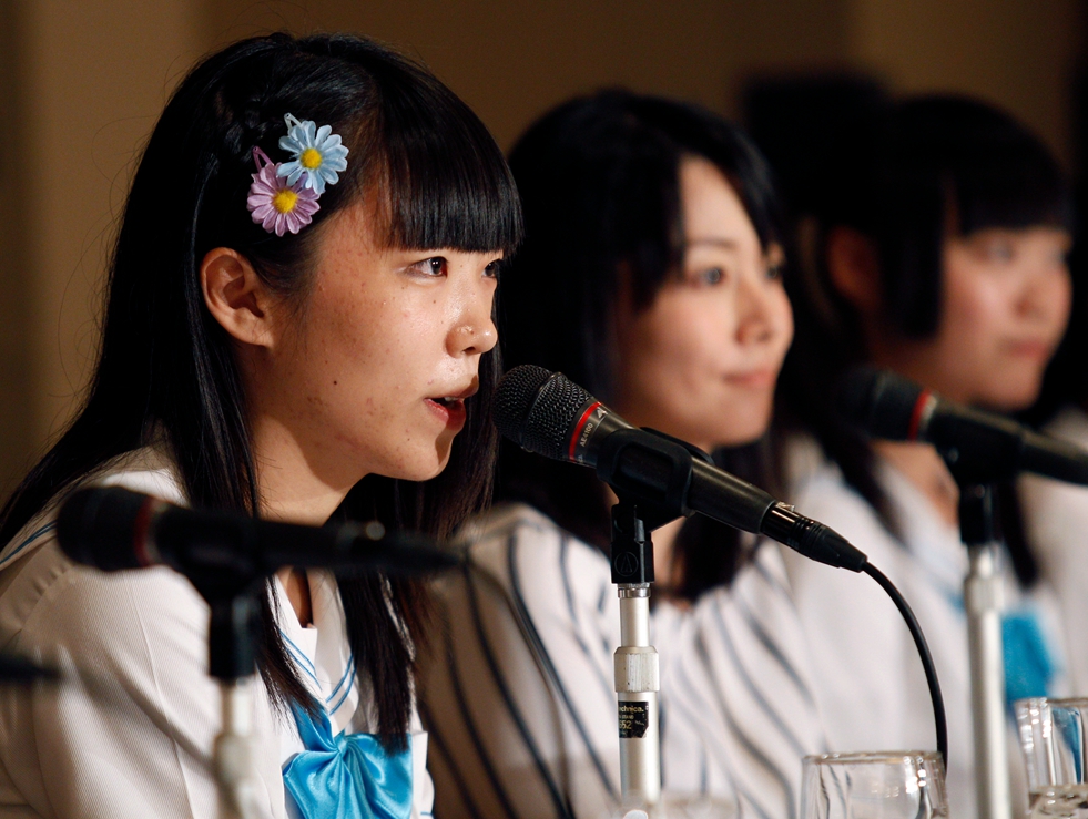 当地时间2015年7月28日,日本东京,日本偶像团体Seifuku Koji Iinkai在东京外国记者俱乐部唱反核电歌曲,参加记者会公开反对政府的安保政策。