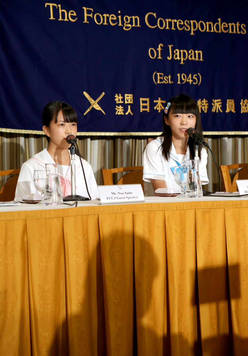 当地时间2015年7月28日,日本东京,日本偶像团体Seifuku Koji Iinkai在东京外国记者俱乐部唱反核电歌曲,参加记者会公开反对政府的安保政策。
