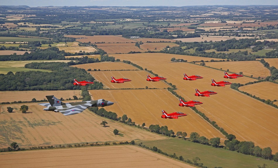 近日,英国红箭皇家空军特技飞行表演队和火神轰炸机组成空中编队,在格洛斯特郡上空伴飞“火神”最后一次飞行表演。当地举行了年度英国皇家国际航空展,“火神”负责人称由于维护资金筹集困难等原因"火神"在此次航展后,将会停飞。