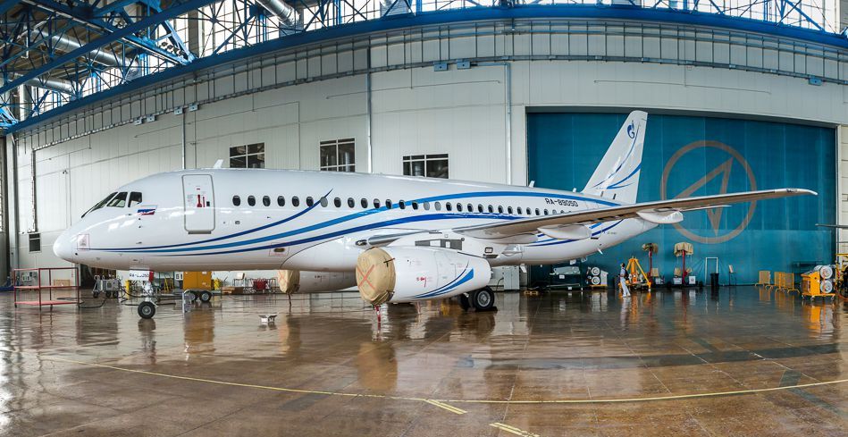 停在机库中的苏霍伊“超级喷气-100”客机。