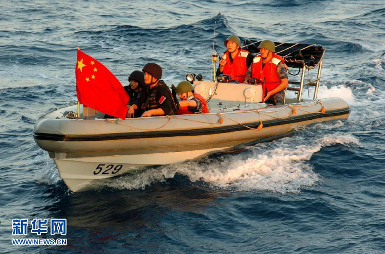 2009年10月23日,在亚丁湾海域,中国海军护航编队“舟山”舰搭载特战队员的舰载小艇正在进行巡逻警戒。本次护航中国海军护航编队首次利用舰载小艇搭载特战队员进行了大范围的海上巡逻警戒,保证了被护商船的安全。郭刚 摄