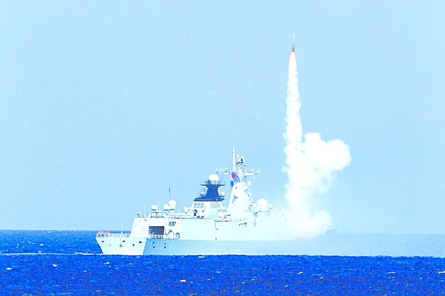 28日,一艘中国军舰在南海演习中发射导弹。
