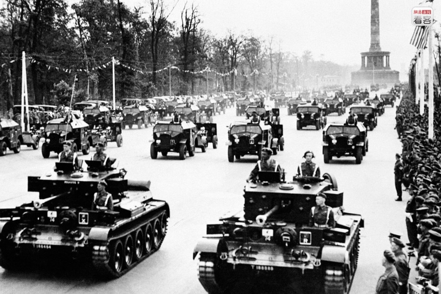 7月21日,英军也在柏林举行胜利阅兵,阅兵的主角是有“沙漠之鼠”称号的英国第7装甲师。阅兵当日,大量英军战车及坦克从宽敞的柏林街道上呼啸而过,吸引不少柏林市民驻足观看。阅兵期间,当时就在柏林的英国首相丘吉尔以及英国陆军元帅蒙哥马利乘坐战车,检阅了英军的战车方队。图为1945年7月21日,柏林,英国首相温斯顿·丘吉尔观看英国作战部队通过德国首都的街道。