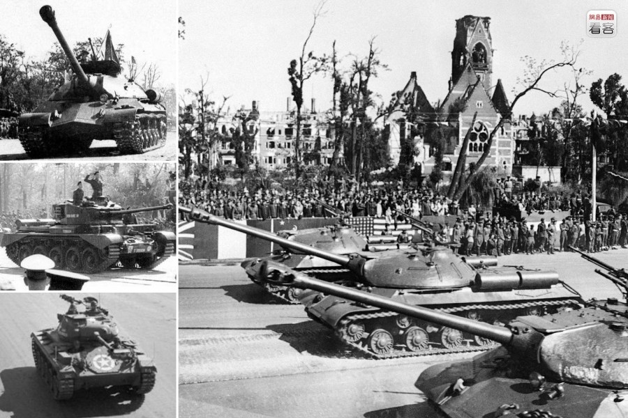 此后,苏联又提议在柏林举行四大盟国联合阅兵式。这次盛大阅兵被定在1945年9月7日。艾森豪威尔和蒙哥马利在最后一刻拒绝出席,改由巴顿和罗波斯顿作为代表。阅兵的主角仍是苏军,在参加阅兵的5000名官兵中,超过2000人来自苏军。苏军首次公开了秘密武器IS-3重型坦克。IS-3为压制德国重型坦克而开发,性能全面凌驾于当时的西方坦克,但没赶上与德国人的较量。苏联特意将它拉出来受阅,威慑意味非常明显,它的亮相同时也坚定了巴顿反对共产主义阵营的信念。盟军在此次阅兵式上所体现出来的貌合神离,被认为是冷战悄然展开的标志之一。大图为1945年9月7日,柏林的海德公园,英美苏法举行胜利游行。小图上至下,苏联IS-3重型坦克、英国A34“彗星”坦克、美军M24霞飞坦克。
