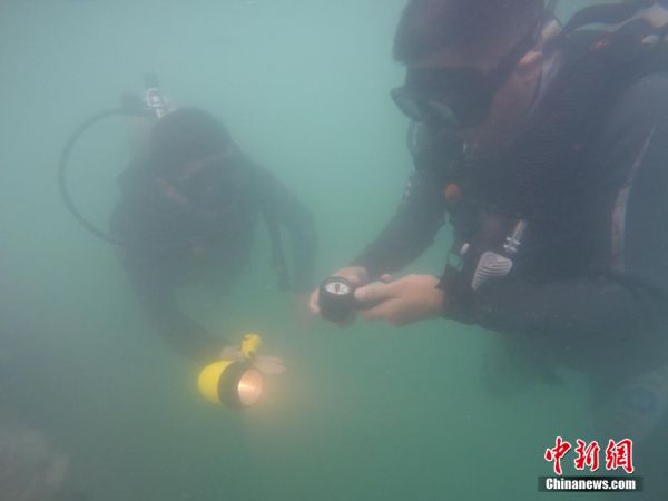 水下能见度很差,在陌生水域水下很容易迷失方向,水下识别方向前往目标区域是渗透训练和水下救灾训练的一项重要内容。图为蛙人在进行水下识别方向训练。张镓 摄