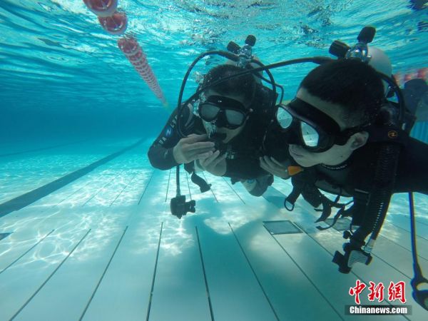 游泳池能见度较高,蛙人突击队部分训练会在游泳池中完成,这是所有训练中最轻松的时刻,主要训练科目为潜水基本动作,如下潜、共用呼吸器、水下穿戴装备、手语等,图为蛙人进行水下共用呼吸器训练。张镓 摄