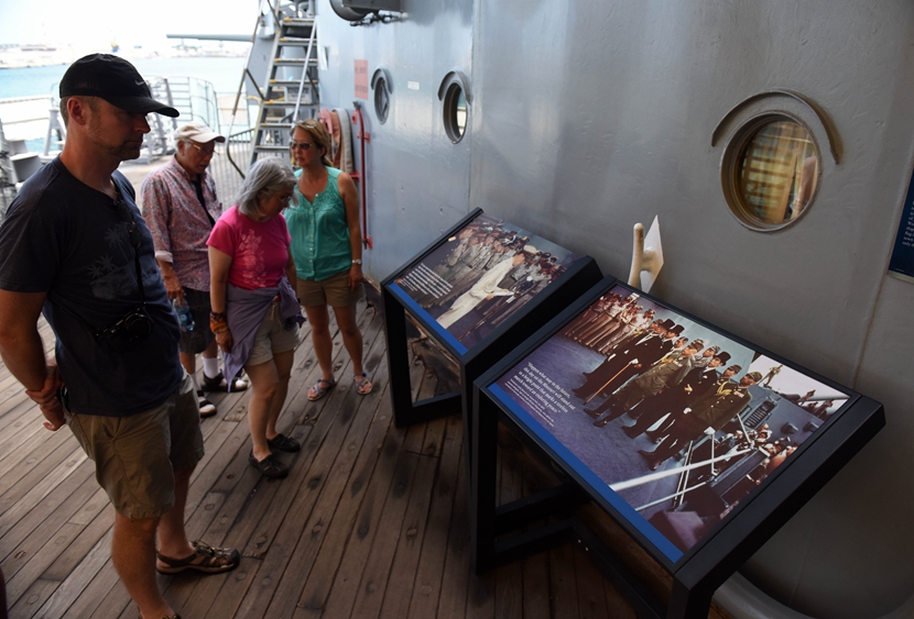 7月30日,在美国夏威夷檀香山珍珠港的密苏里号战列舰上,游客观看日本向盟军投降仪式的照片。新华社记者 殷博古摄