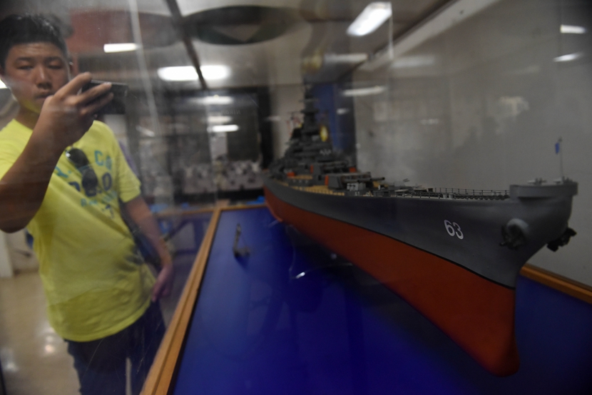 7月30日,在美国夏威夷檀香山珍珠港的密苏里号战列舰上,游客观看密苏里号的模型。新华社记者