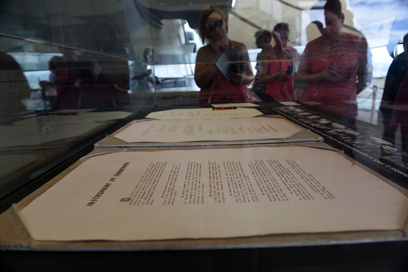 7月30日,在美国夏威夷檀香山珍珠港的密苏里号战列舰上,游客观看日本投降书。新华社记者