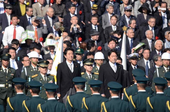 二战之后,日本的新宪法第九条规定,日本放弃与他国以军事手段解决争端的权力,因而日本的自卫队在名义上不是军事组织,但实际功能等同于他国军队。日本自卫队纪念日为每年11月1日,自卫队每隔3年举行一次阅兵,阅兵仪式一般在朝霞基地举行。图为2013年10月25日, 日本首相安倍晋三和防卫大臣小野寺五典出席自卫队阅兵式。(网站截图)