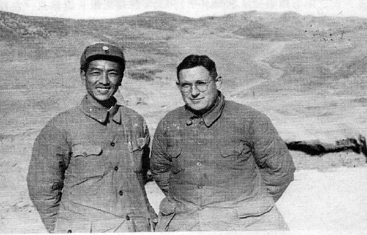 1944年10月,耿飚(左)和美军观察组组长德穆克在从延安赴晋察冀途中。(资料图片)