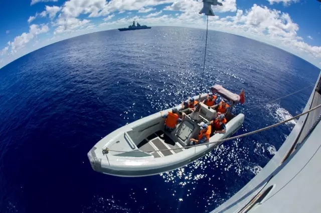 下午2点,长春舰吊放小艇,准备送人换乘至常州舰。编队远海训练,除了信息系统通畅外,舰艇之间的人员换乘也越来越频繁。战士们戏说现在搭直升机和小艇就像搭公交车一样简单。(王天益摄)