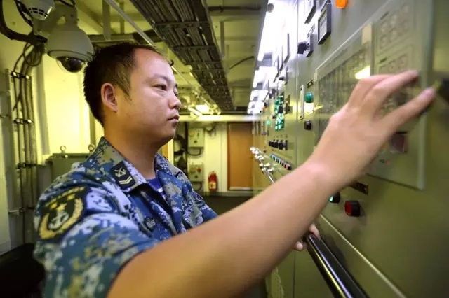 晚上10点,电工兵彭银在检查舰艇电站的运行参数。作为舰艇的电力心脏,这里为全舰的武器装备供电、配电。彭银笑着说,他们电工兵是在“用1500转的激情、50赫兹的梦想,传递380伏的正能量”。(贾岩岩摄)