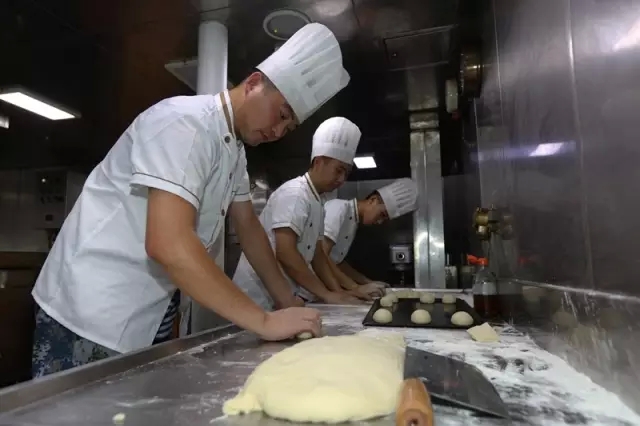 凌晨5点,炊事兵、上士孙泽明和战友们在揉面,准备制作烤面包。长春舰新增的多功能烤箱、烙饼机、豆芽机等新的厨房设备,为炊事班制作多样化的饭菜提供了便利。